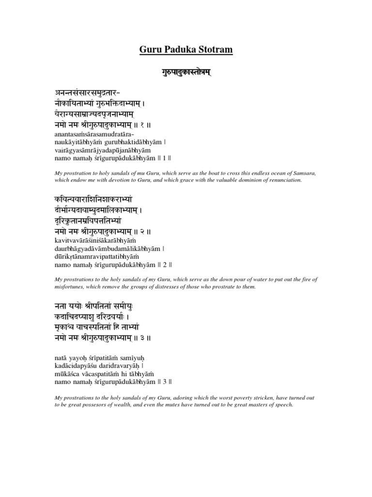 Guru Paduka Stotram With Lyrics In English And Sanskrit Youtube Sanskrit Words Lyrics Guru - My prostration to holy sandals of mu guru, which serve as the boat to cross this endless ocean of samsara, which endow me with devotion to guru, and which grace with the valuable dominion of renunciation.