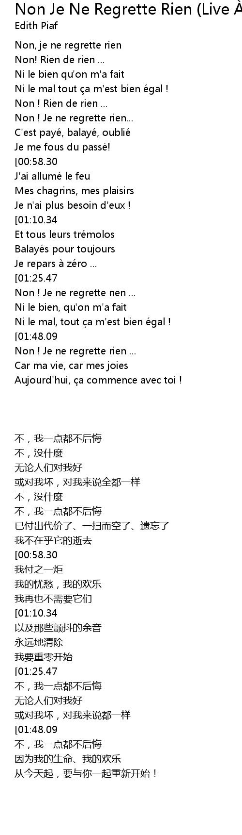 Je Ne Regrette Rien Lyrics : Car ma vie, car me joies. Je Ne Regrette Rien Lyrics - Non, rien de rien, non, je ne regrette rien.