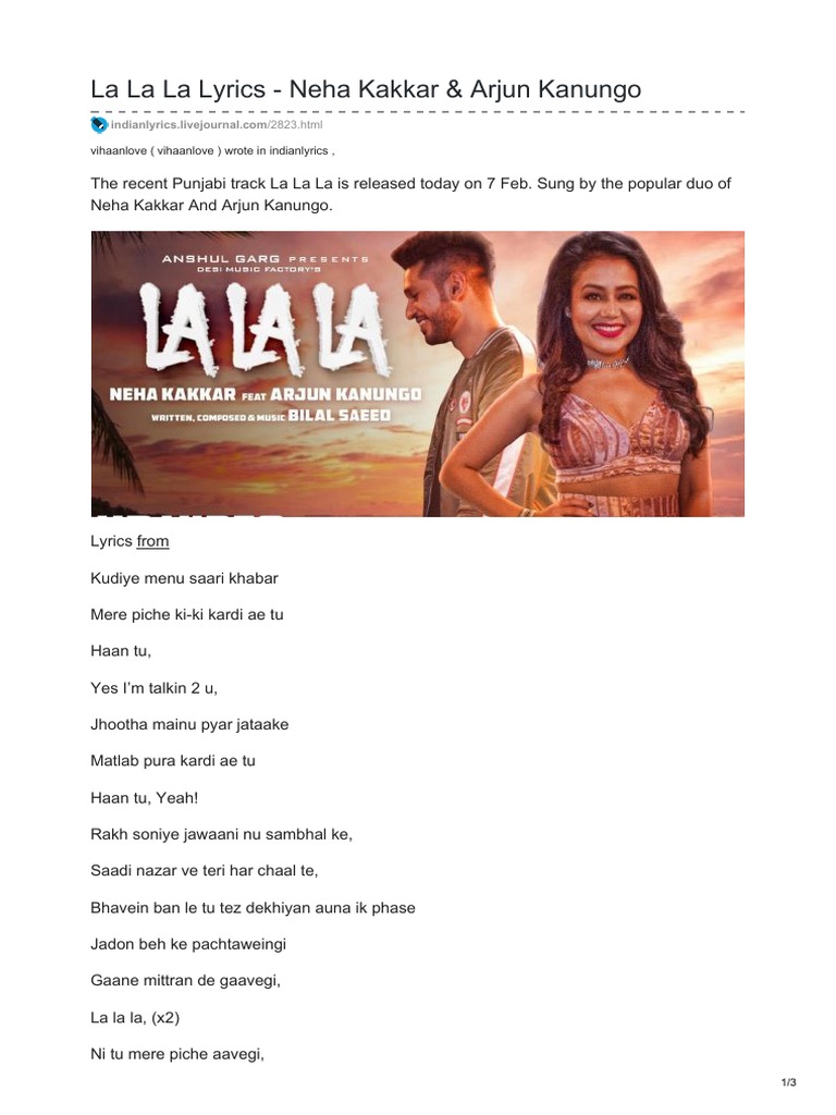 Lalala Lyrics Neha Kakkar In Hindi : Song lyrics is written by jaani we providing with meaning and translation of english and hindi language. Lalala Lyrics Neha Kakkar In Hindi : Song credits tags hindi new song lyrics, lyrics.