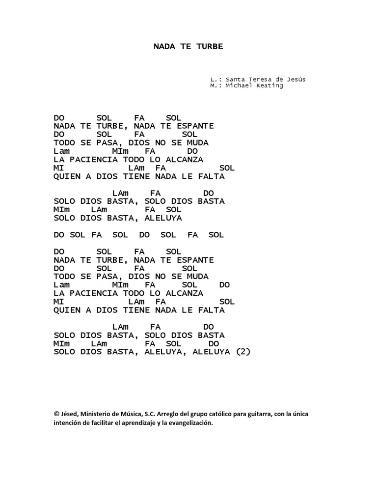 Cancionero Con Acordes De La Renovacion Carismatica - .mi confianza (nada te turbe, nada te espante) y de el solo mi asimiento (quien a dios tiene, nada le falta) en sus cansancios mi aliento (nada te turbe (nada te turbe, nada te espante) pues que no hay paz en la tierra (solo dios basta) no haya ningun cobarde (nada te turbe, nada te espante).