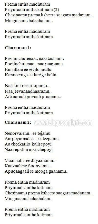 Prema Entha Madhuram Song Lyrics From Abhinandana Karthik Shobhana Telugulyrics2u - For your search query prema entha madhuram song lyrics mp3 we have found 1000000 songs matching your query but showing only top 10 results.