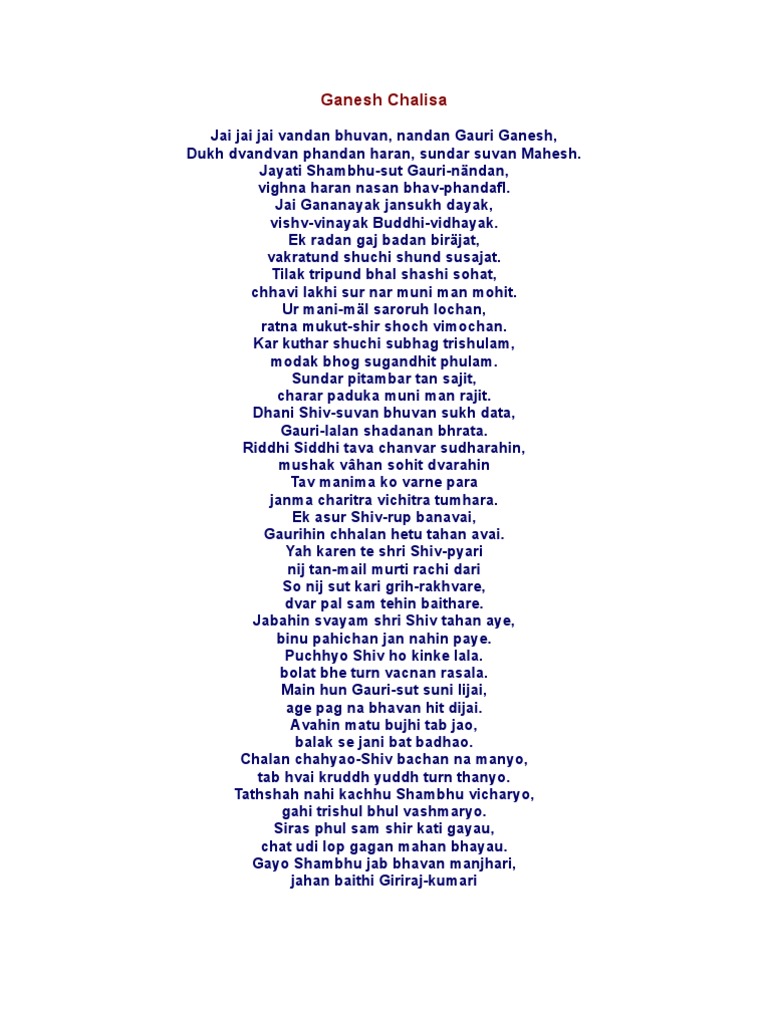 Ganesh Chalisa Pdf गण श च ल स प ड ऍफ Aarti Chalisa - Jai jai jai ganpati gajraju, mangal bharan karan shubh kaaju, jai gajbadan sadan sukhdata ganesh chalisa super fast is a new fast version of the most popular hindu devotional bhajan shri ganesh chalisa recited with.